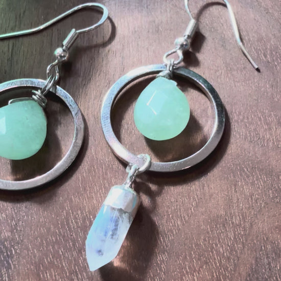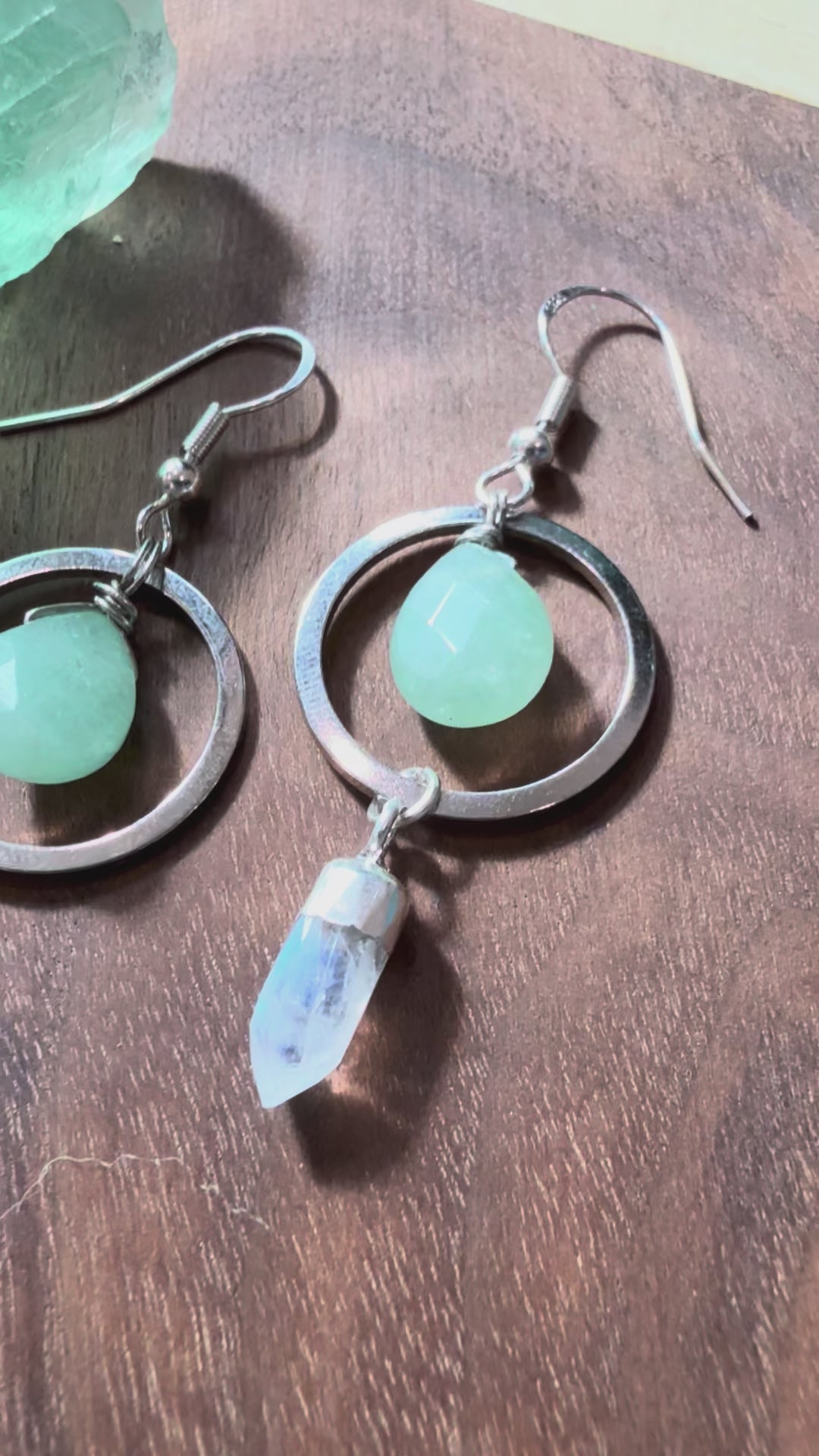Aqua Marine Tear Drop Gemstones with Moonstone Prisms on Silver Hoop